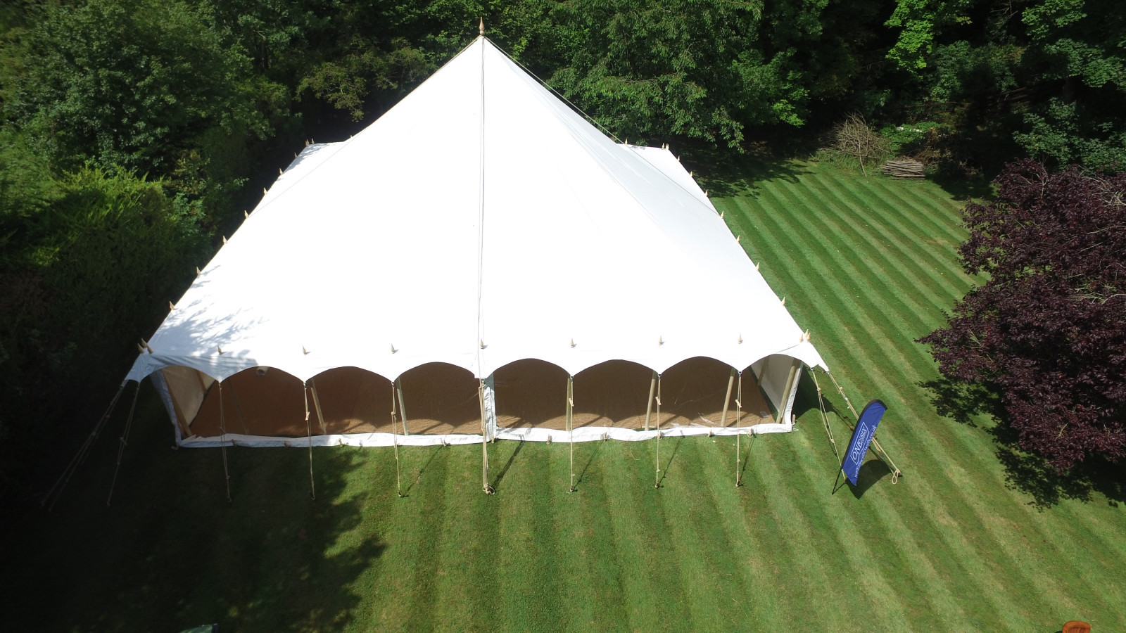 These are constructed of wooden interior poles with central ‘king poles’ and can be canvas or PVC. They are secured by guy ropes and stakes, and can be erected on grass. These lend themselves well to vintage, shabby-chic or rustic themed events. You are able to add internal linings to these. The classic English country garden marquee.