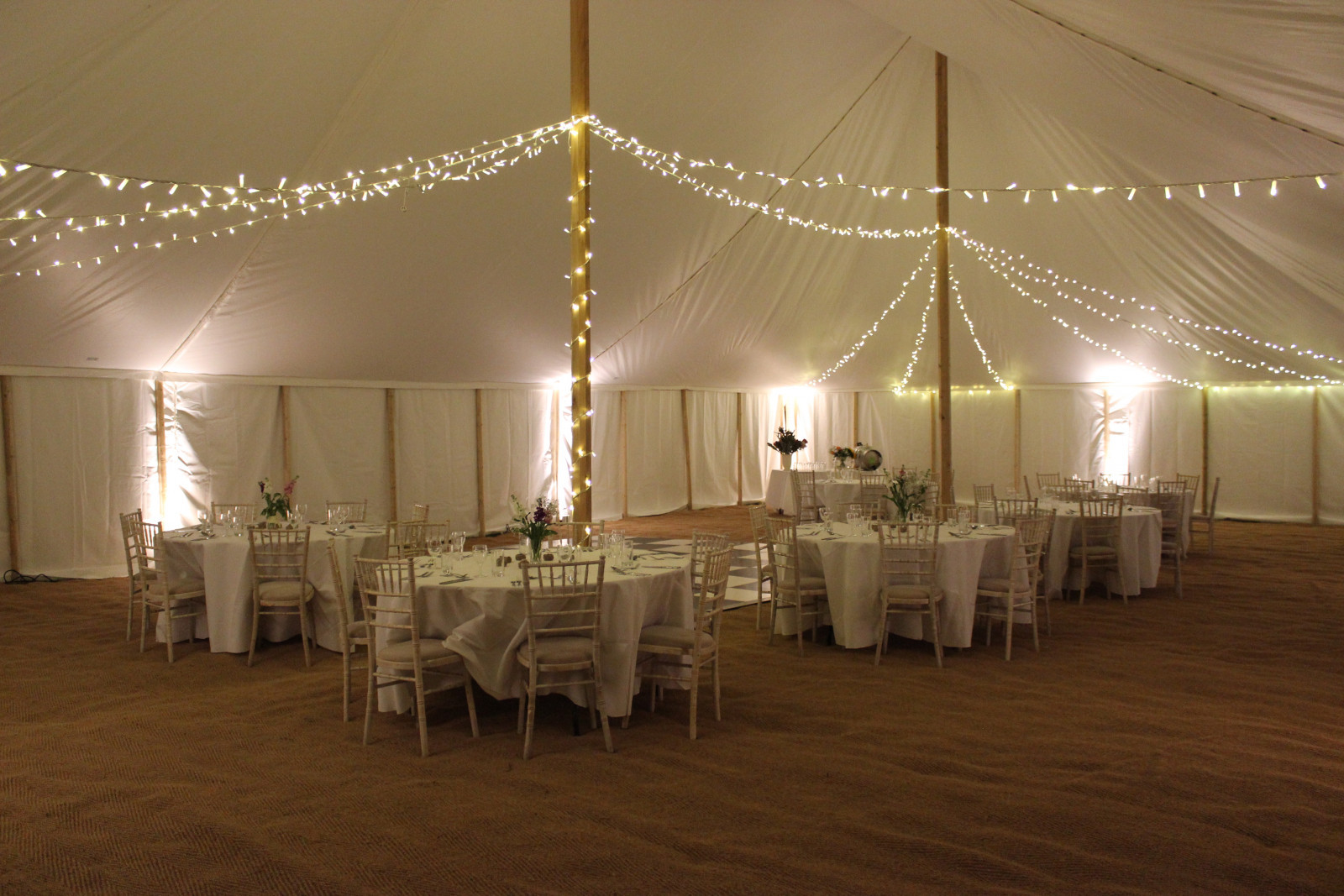 Such an important aspect to any marquee wedding, moreover any event in a marquee. It is vital to get it right so that as the daylight dies, the marquee comes alive. Your marquee firm will guide you. All of our lighting is LED and probably our client’s most popular configuration is LED uplighters together with a fairy light canopy and external festoon lighting over the marquee. Circuits can be put on dimmers so the fairy light canopy or uplighters in this instant can be dimmed if they are over powering later in the evening.
