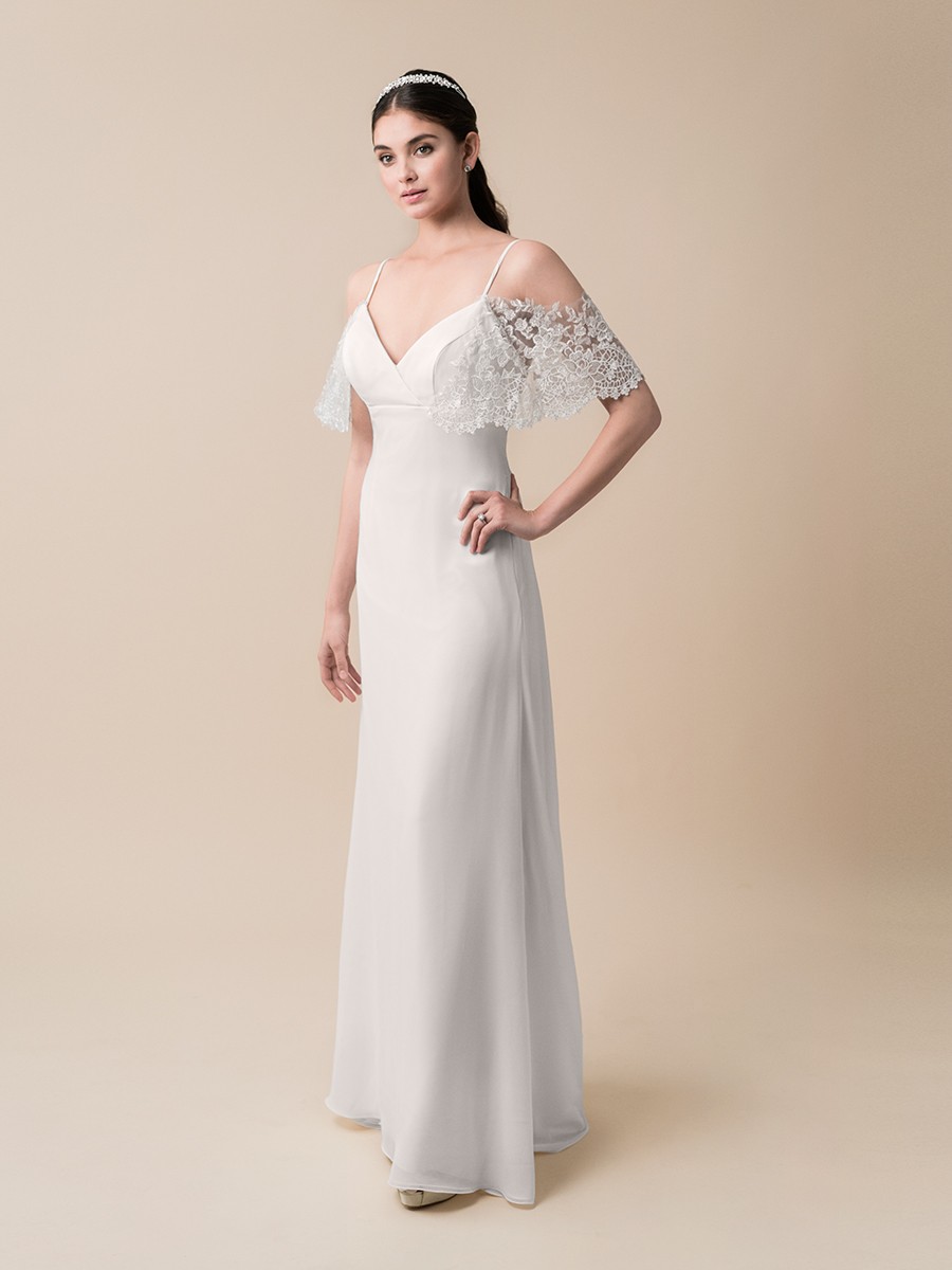 Based in sunny Southern California, Val Stefani has a unapologetic love of all things feminine. Expect their collections to include ruffles, lace, delicate beading, rolled rosettes and all things girlie. This dress is a wonderful take on a long sleeved off the shoulder look, with immensely detailed layers of gorgeous lacing running down the whole length of it.
