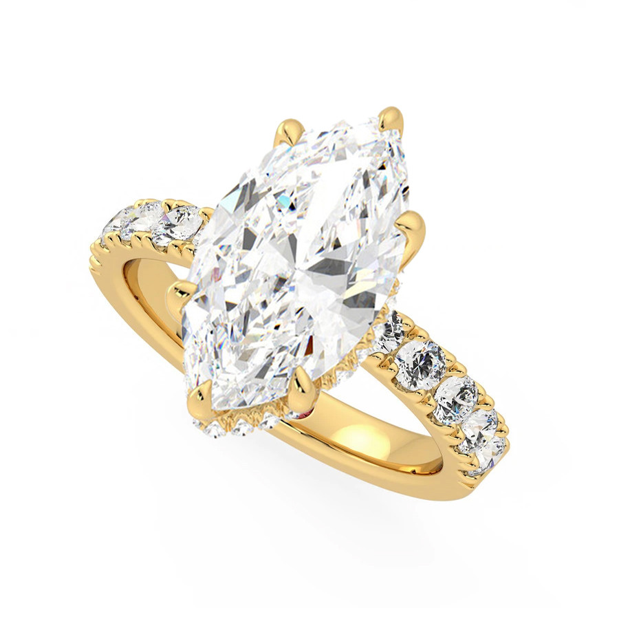 Let’s take a moment to talk about the mesmerising ring. The marquise diamond design sits proudly on a yellow gold diamond pavé eternity band. Its faceted cut catches the light in ways that show a love story told in sparkles.